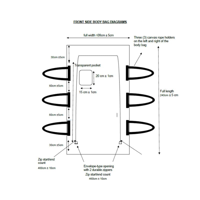 1.3 The body bag must measure 240cm ± 5cm (L) x 108cm ± 5cm (W). (refer to
